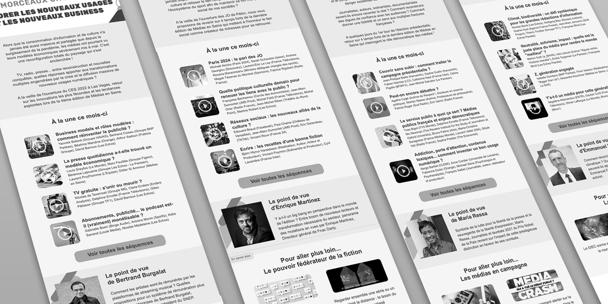 LES ECHOS x FRANCEINFO Conception d’une newsletter éditorialisée. Chaque mois autour d’une thématique de Médias en Seine, rédaction d’un éditorial, choix des conférences de l’événement à pousser en replay, mise en avant du point de vue d’une personnalité, veille et sélection de 2 contenus pour aller plus loin sur le thème de la newsletter.